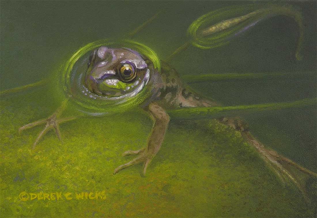 Many times I sat beside my old pond and enjoyed the company of green frogs, peepers and birds having a bath. This original shares one of those golden moments.